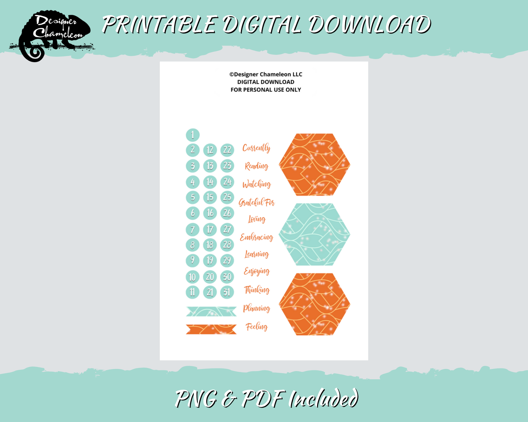 Currently and Date Sheet -31 date dots, 11 currently prompts, 3 hexagons, 2 banners (47 total stickers)